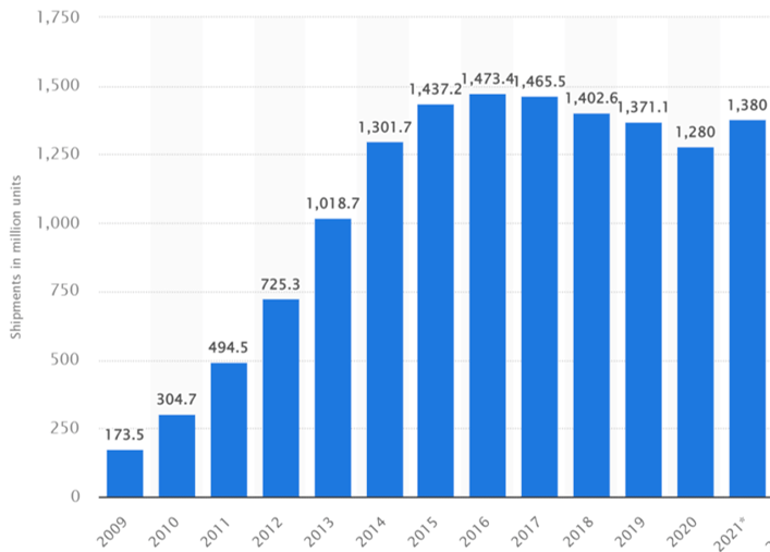 2017年以來全球手機出貨量持續(xù)下降,2021年略微回溫資料來源:Counterpoint
