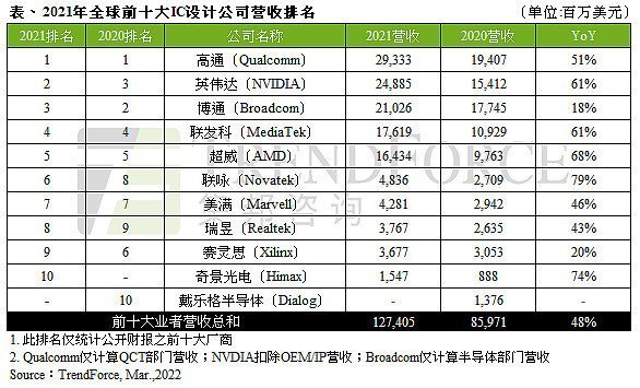 據(jù)TrendForce集邦咨詢研究顯示,2021年由于各類終端應(yīng)用需求強(qiáng)勁,導(dǎo)致晶圓缺貨,全球IC產(chǎn)業(yè)嚴(yán)重供不應(yīng)求連帶使芯片價格上漲,拉抬2021年全球前十大IC設(shè)計業(yè)者營收至1,274億美元年增48%。
